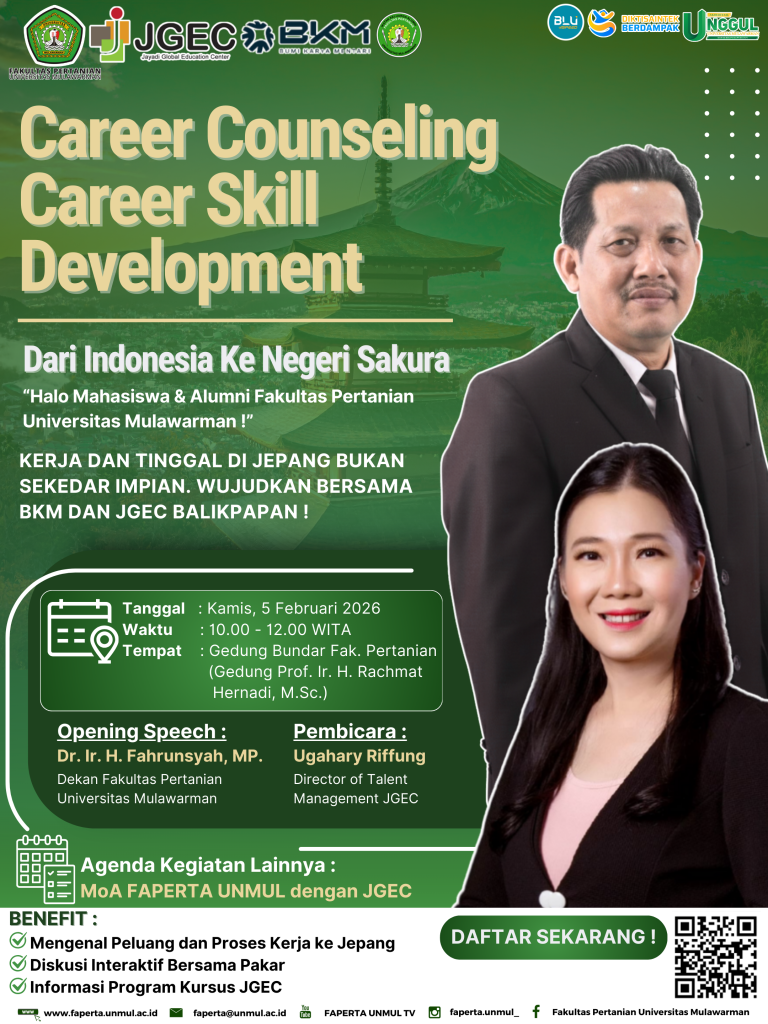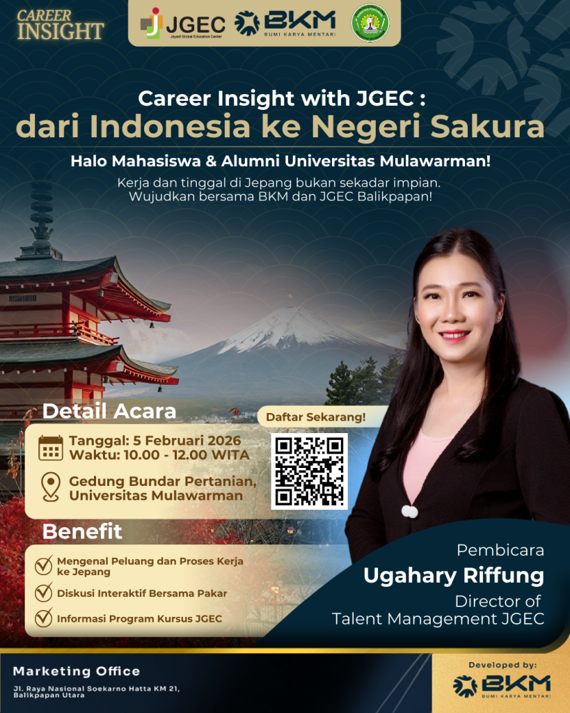 Mari wujudkan langkah karier internasionalmu bersama JGEC Balikpapan dan BKM dalam acara Career Insight khusus untuk Mahasiswa & Alumni Universitas Mulawarman.