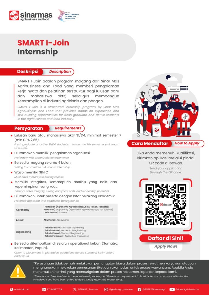 Sinar Mas Agribusiness and Food membuka kesempatan magang melalui Program SMART I-Join Internship, sebuah program magang terstruktur yang memberikan pengalaman kerja nyata serta pelatihan profesional bagi mahasiswa aktif dan lulusan baru.