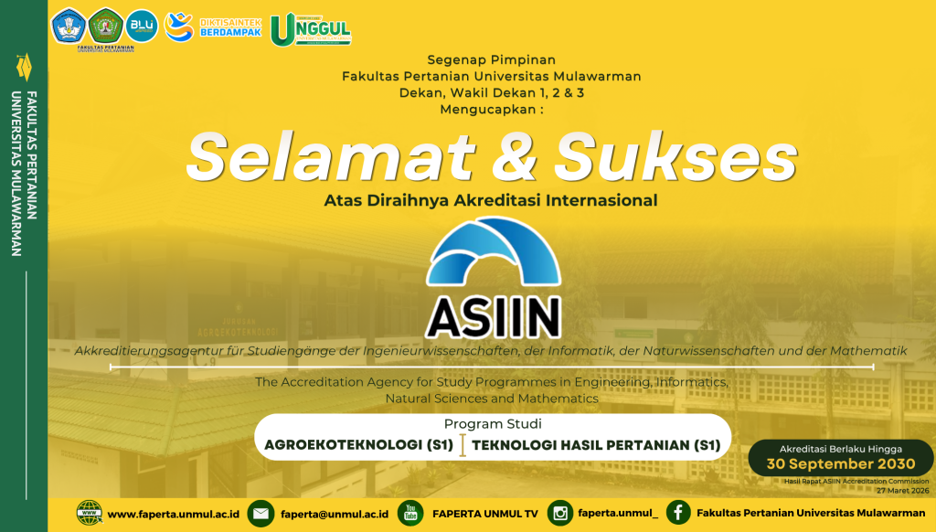 Samarinda – Fakultas Pertanian Universitas Mulawarman kembali menorehkan prestasi membanggakan di tingkat internasional. Program Studi Agroekoteknologi (S1) dan Teknologi Hasil Pertanian (S1) berhasil meraih Akreditasi Internasional dari Accreditation Agency for Study Programmes in Engineering, Informatics, Natural Sciences and Mathematics (ASIIN).