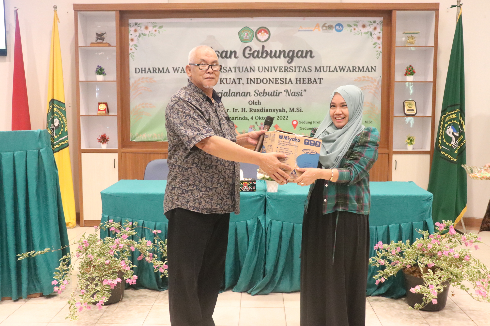 Beralih ke sesi selanjutnya yaitu sambutan sekaligus pemaparan materi dari Dekan Fakultas Pertanian Universitas Mulawarman, Bpk. Prof. Dr. Ir. H. Rusdiansyah, M.Si. disini beliau banyak menyampaikan materi-materi nya dengan judul “Perjalanan Sebutir Nasi”.
