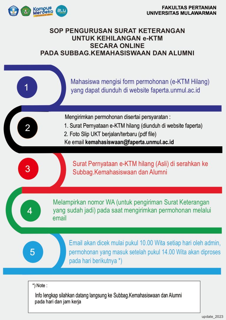 Mahasiswa mengisi Form permohonan (e-KTM Hilang) yang dapat di unduh di link iniĀ  Surat Permohonan Mengirimkan permohonan disertai persyaratan : 1. Foto…