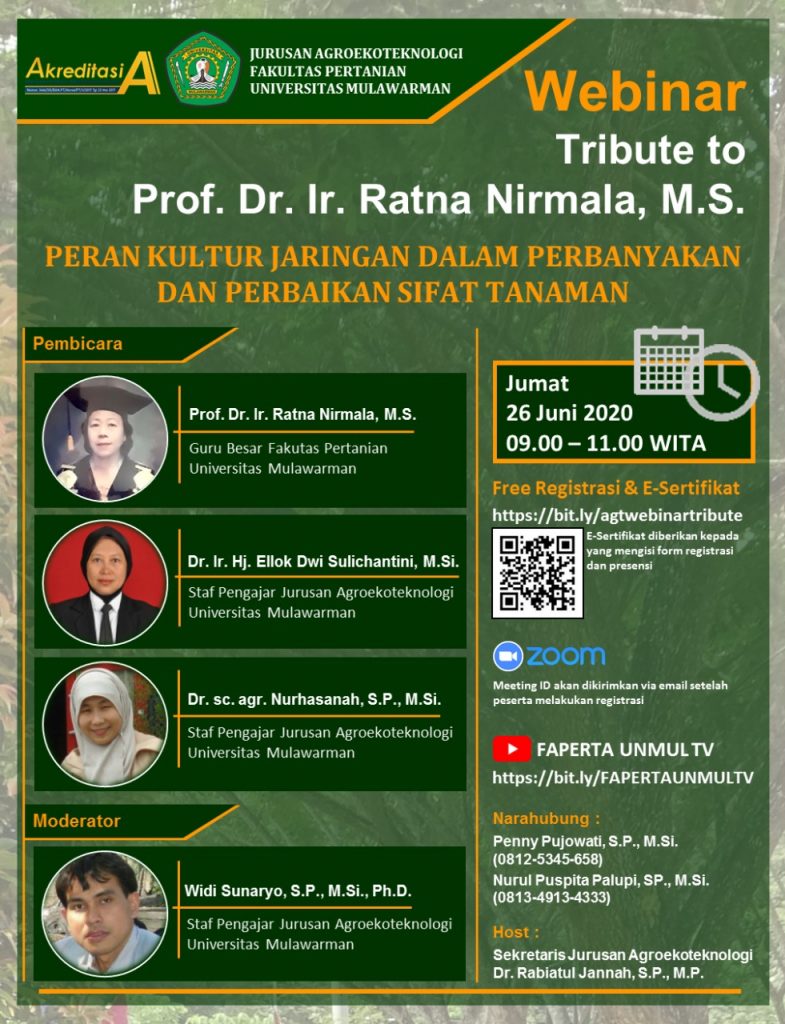 Jurusan Agroekoteknologi FAPERTA UNMUL menyelenggarakan Webinar Tribute to Ibu Prof. Dr. Ir. Ratna Nirmala, M.S.