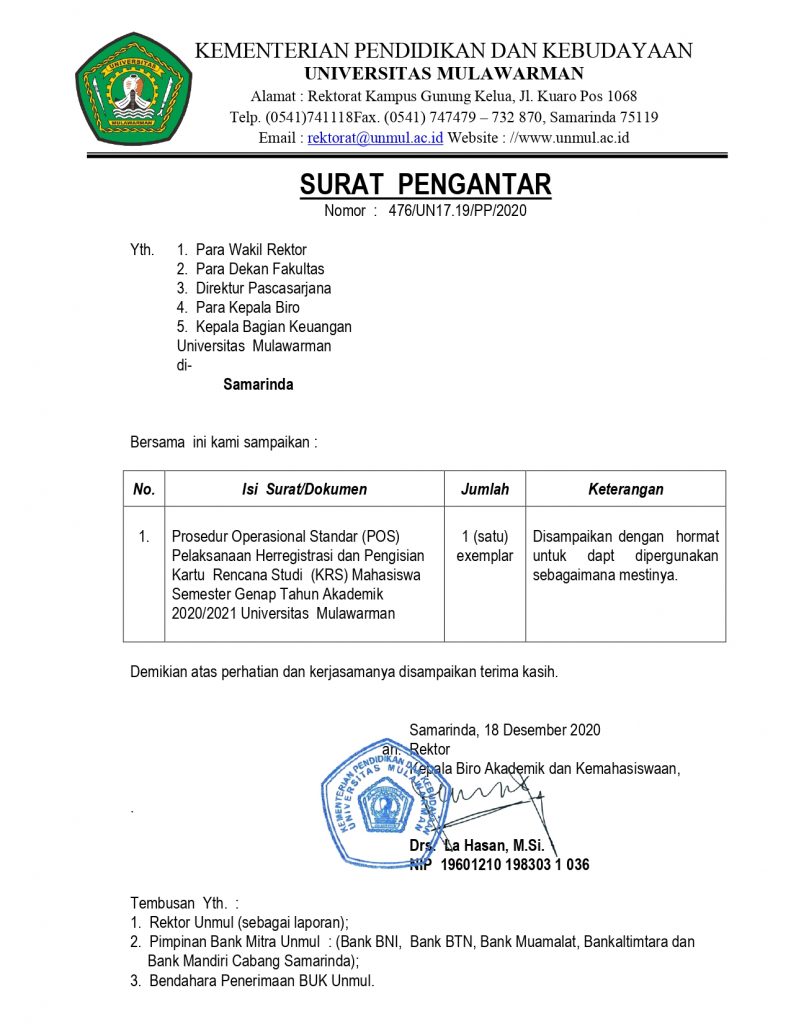 Informasi Prosedur Operasional Standar (POS) Pelaksanaan Herregistrasi dan Pengisian Kartu Rencana Studi (KRS) Mahasiswa Semester Genap Tahun Akademik 2020/2021 Universitas Mulawarman