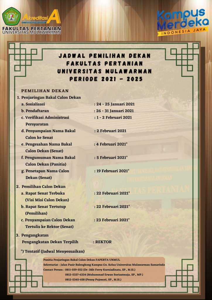 Fakultas Pertanian Universitas Mulawarman akan menyelenggarakan pemilihan Dekan periode 2021-2025. Rangkaian tahapan kegiatan direncanakan akan berlangsung sejak tanggal 24 Januari 2021 sampai dengan 23 Februari 2021 mendatang. Adapun informasi tahapan pemilihan dekan fakultas pertanian periode 2021-2025 sebagaimana yang ditampilkan pada informasi diatas.