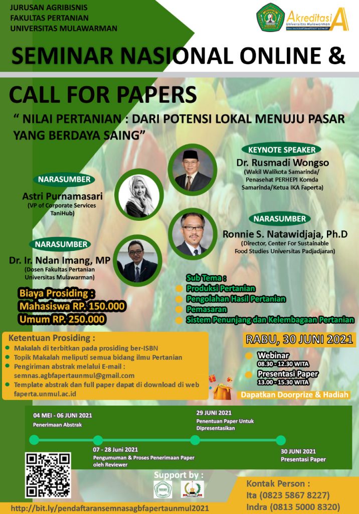 Fakultas Pertanian Universitas Mulawarman dalam hal ini diwakili Jurusan Agribisnis sebagai panitia kembali mengadakan acara Seminar Nasional Online & Call For Papers Tahun 2021. Seminar Online yang dilaksanakan satu hari penuh pada hari Rabu, 30/6/2021 tepat pada pukul 08.00 – 16.00 WITA ini dilaksanakan secara daring via ZOOM Meeting dikarenakan seperti yang kita ketahui masih belum berhenti dan meningkatnya wabah kondisi virus covid-19 yang melanda Indonesia khususnya di Kota Samarinda sampai saat ini sehingga memaksa tidak bisanya dilaksanakan seminar dengan tatap muka langsung antar pemateri dan peserta.