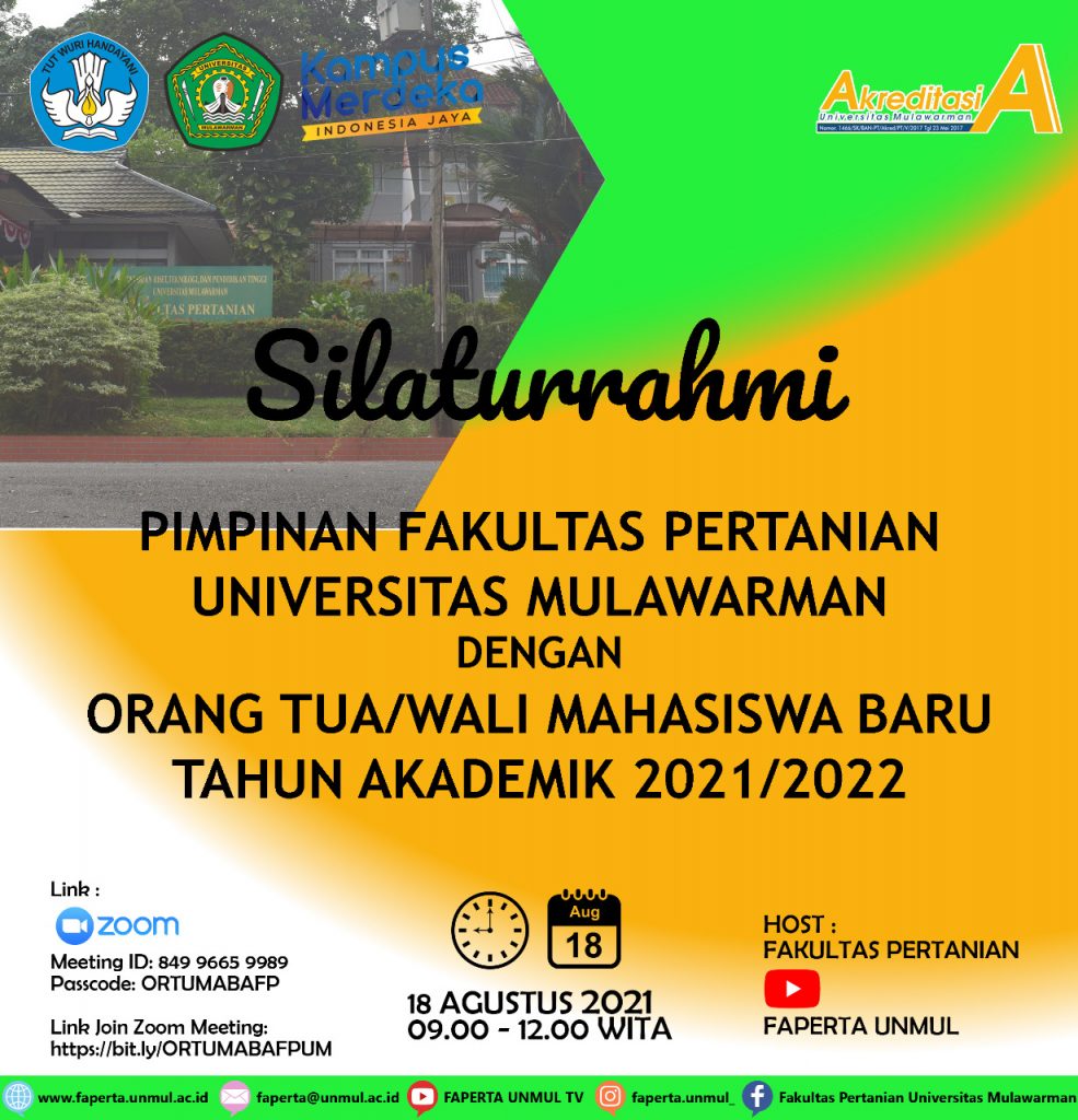 Fakultas Pertanian Universitas Mulawarman melangsungkan pertemuan dengan Orang Tua/Wali Mahasiswa Baru Tahun Ajaran 2021/2022 tepat pada hari Rabu, 18 Agustus 2021 pukul 09.00-12.00 WITA. Pada momen kali ini, berbeda dengan di tahun sebelumnya yang mana pertemuan orang tua/wali mahasiswa baru masih bisa dilaksanakan secara tatap muka langsung namun di tahun 2021 ini, dengan kondisi pandemi Covid-19 yang masih melanda Indonesia ini terpaksa harus diadakannya kegiatan tersebut secara online (daring) melalui virtual video conference (Zoom Meeting).