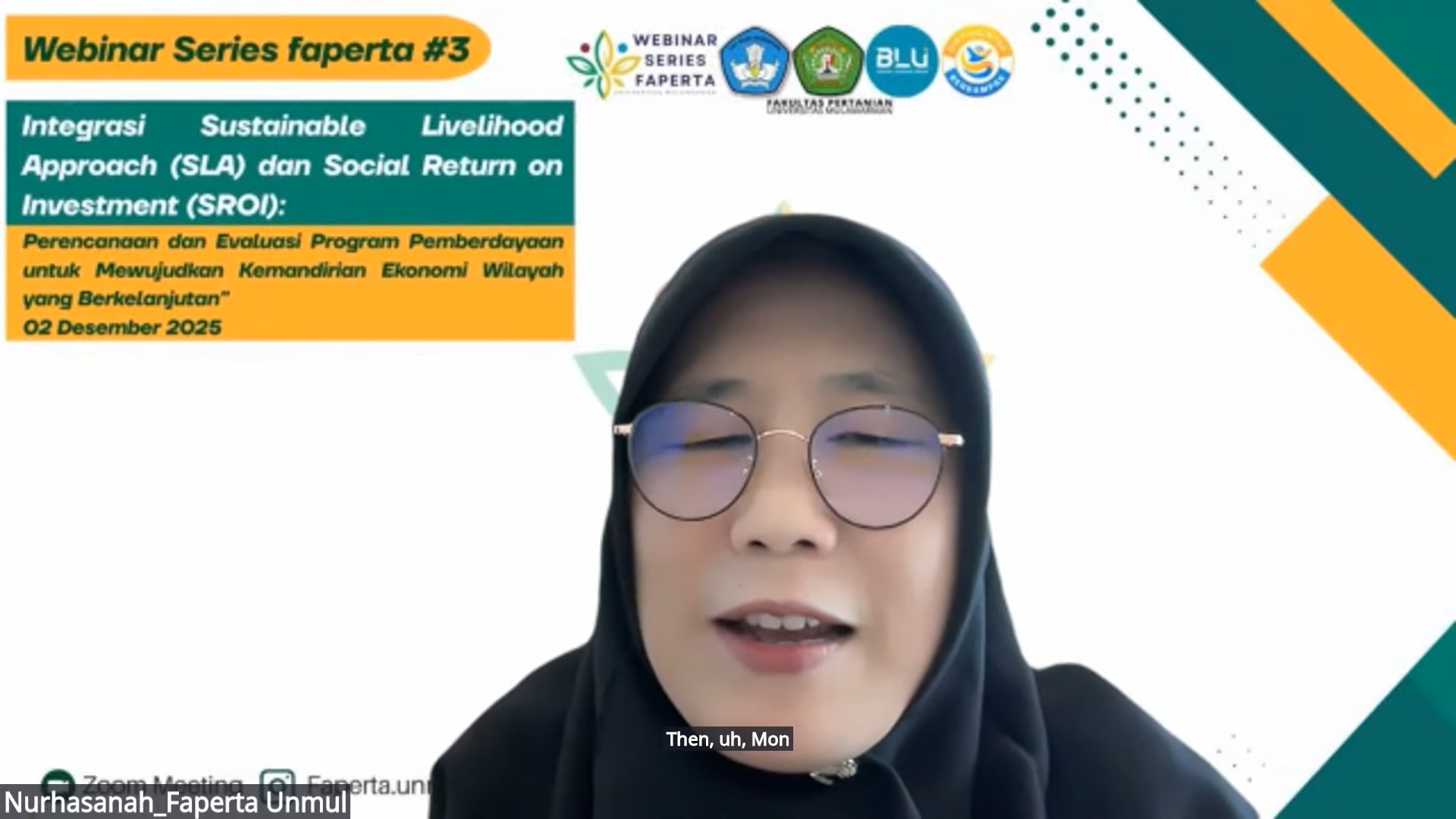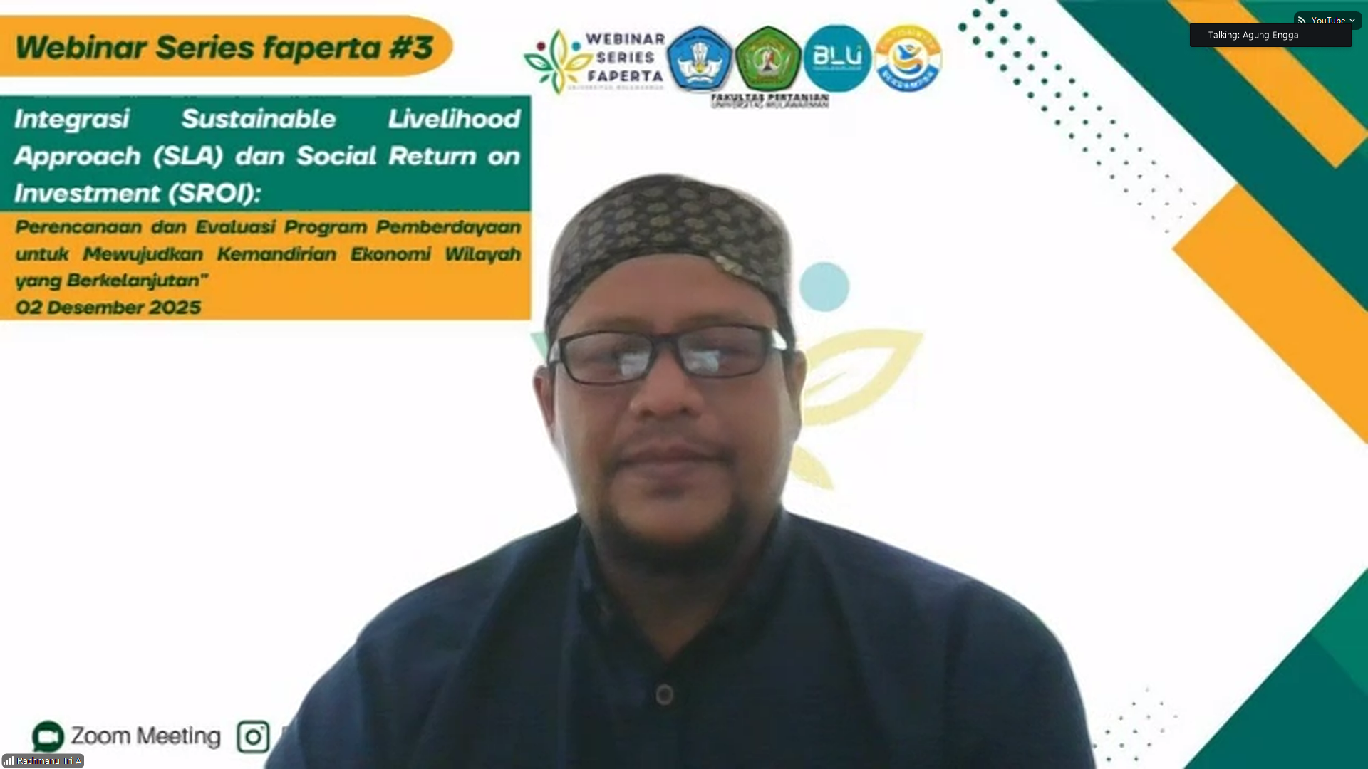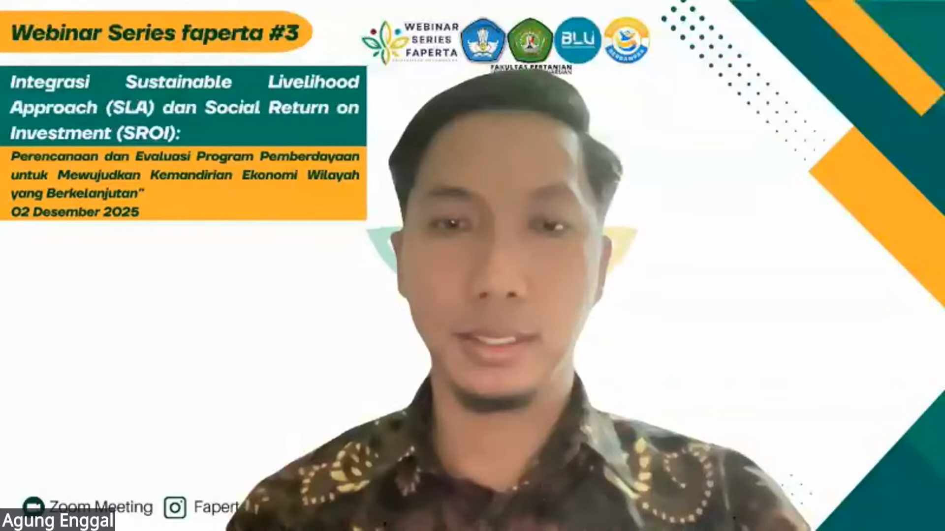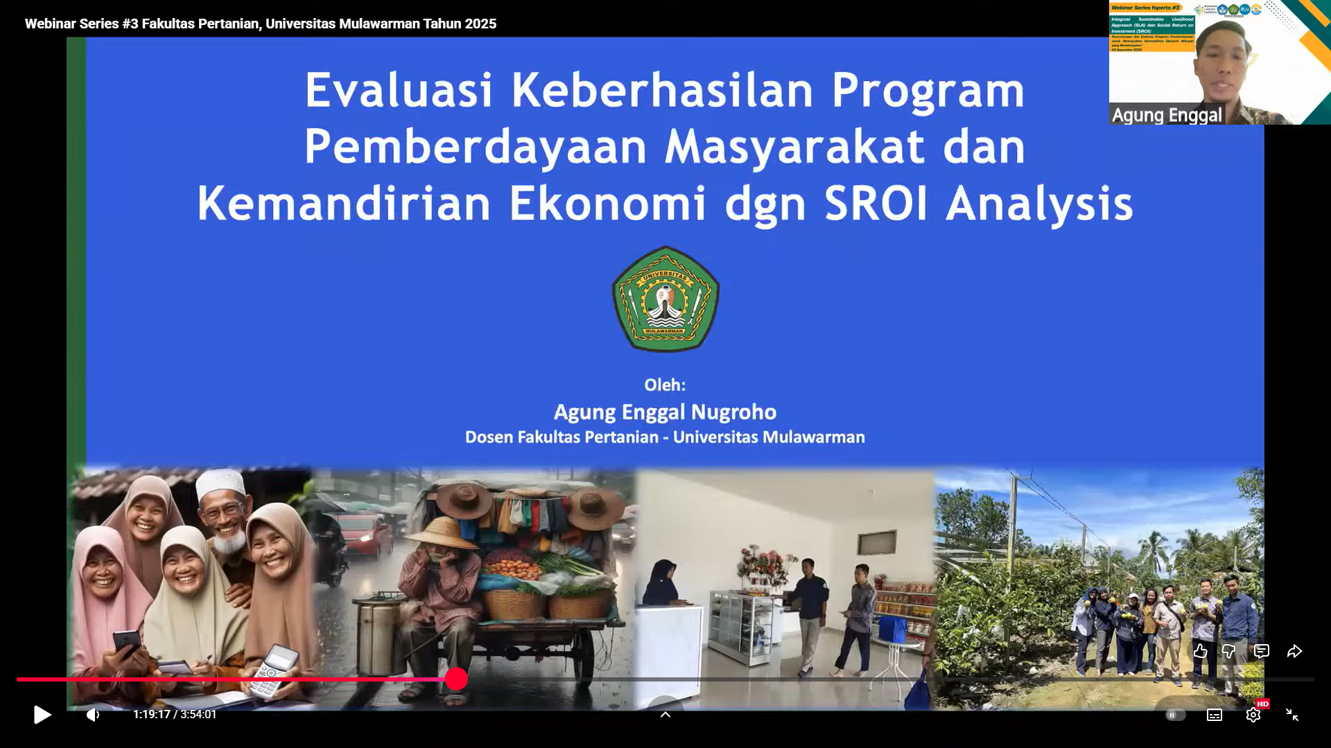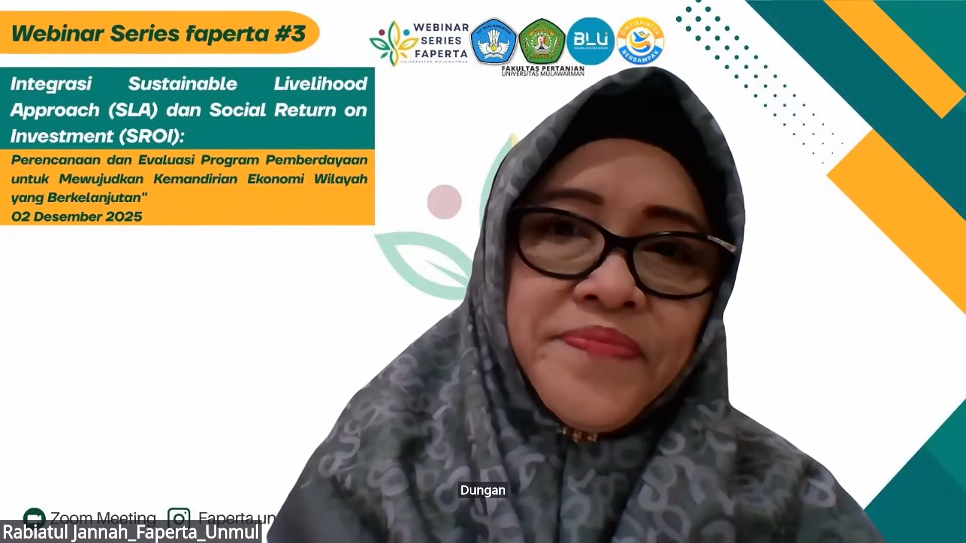 Samarinda, 2 Desember 2025 – Fakultas Pertanian Universitas Mulawarman menggelar Webinar Series 3 dengan tema “Integrasi Sustainable Livelihood Approach (SLA) dan Social Return on Investment (SROI): Perencanaan & Evaluasi Program Pemberdayaan untuk Mewujudkan Kemandirian Ekonomi Wilayah yang Berkelanjutan”. Acara ini dilaksanakan pada Selasa, 2 Desember 2025, pukul 08.00 WITA secara daring melalui platform Zoom dan YouTube, yang diikuti oleh 146 peserta.