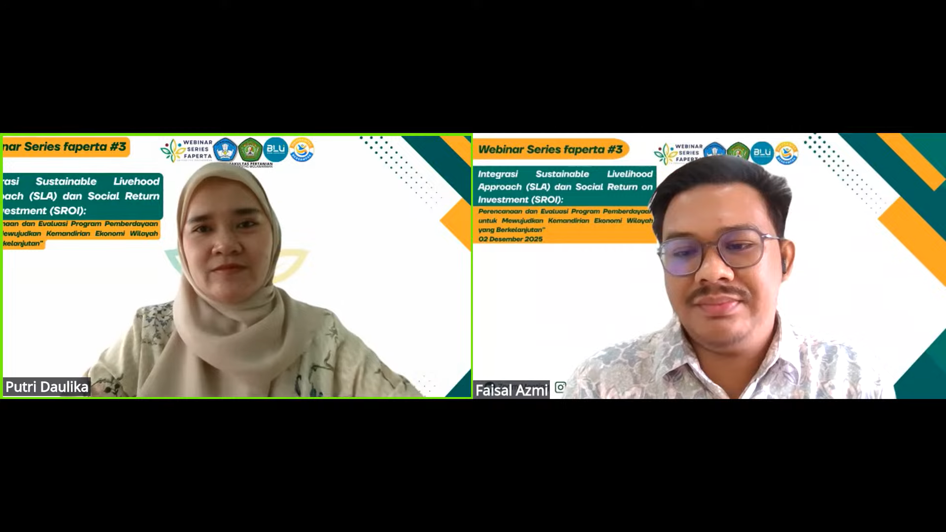Webinar ini dipandu oleh moderator, Webinar ini dipandu oleh dua moderator berkompeten, yakni Putri Daulika, S.P., M.P., M.BA dan Faisal Azmi, S.P., M.Si, yang mengarahkan jalannya diskusi dan interaksi dengan peserta.
