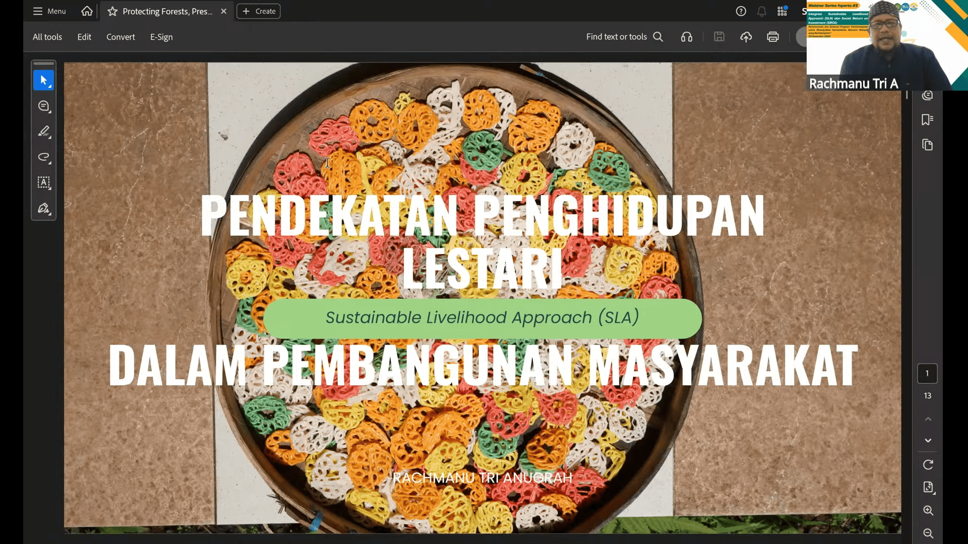 Selanjutnya, Rachmanu Tri A. S, St. Par, menyampaikan konsep SLA yang berfokus pada integrasi antara keberlanjutan penghidupan masyarakat dengan pembangunan ekonomi yang inklusif dan berkelanjutan.