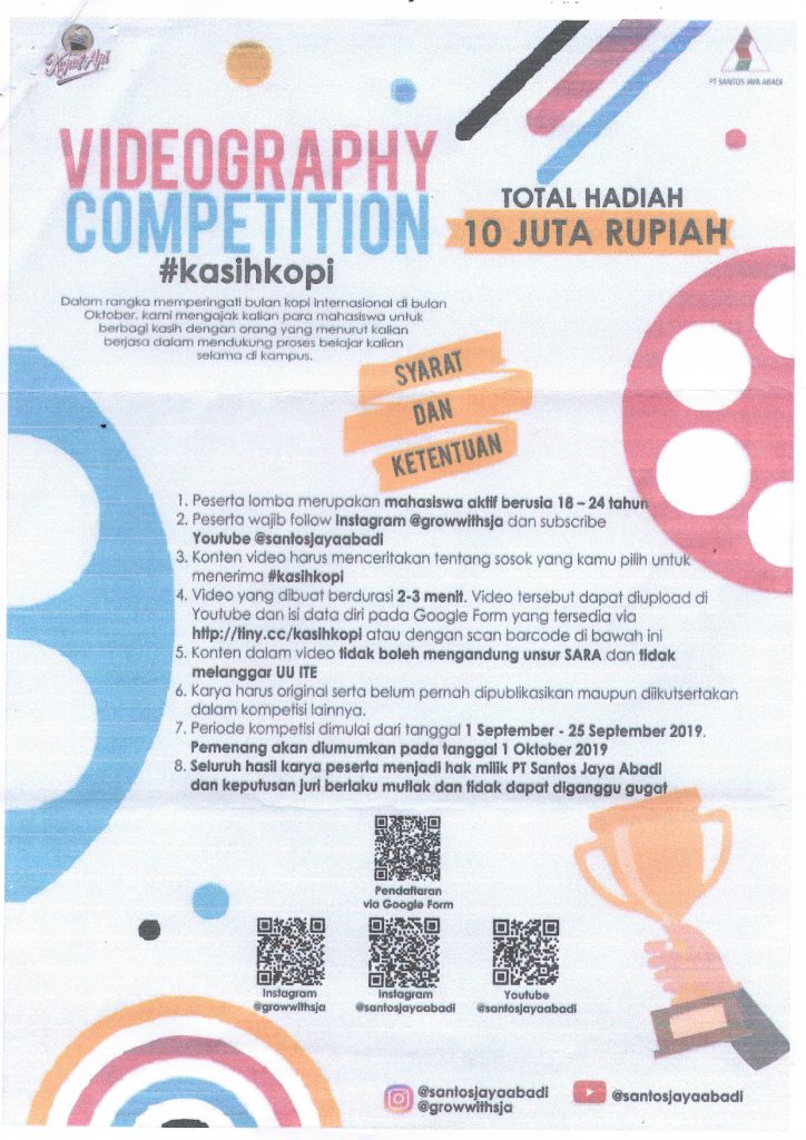 PT. Santos Jaya Abadi mengadakan Lomba Kasih Kopi Event dalam rangka memperingati bulan kopi internasional di bulan Oktober. Bagi para mahasiswa diharapkan dapat berbagi kasih dengan orang yang menurut kalian berjasa dalam mendukung proses belajar kalian selama dikampus.