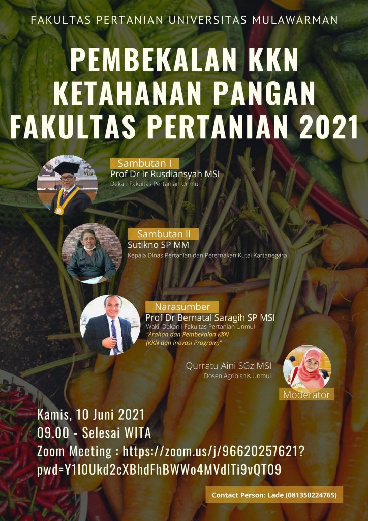 Kami mengundang bapak/ibu, rekan-rekan, mahasiswa/i, untuk bergabung mengikuti Pembekalan KKN Ketahanan Pangan Fakultas Pertanian Universitas Mulawarman Tahun 2021, mari bergabung bersama kami.
