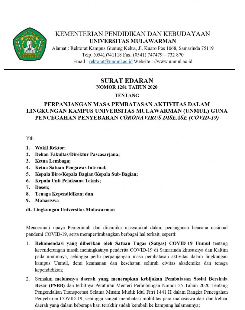 Surat Edaran Perpanjangan Masa Pembatasan Aktivitas Dalam Lingkungan Kampus Universitas Mulawarman (UNMUL)