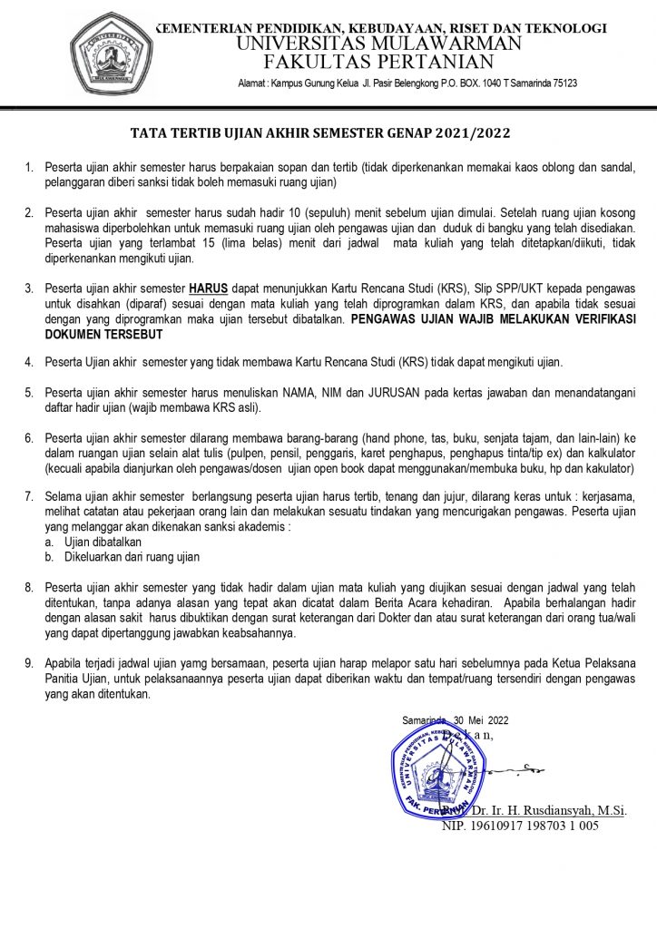 Tata Tertib Ujian Akhir Semester Genap Tahun Akademik 2021/2022 Fakultas Pertanian Universitas Mulawarman