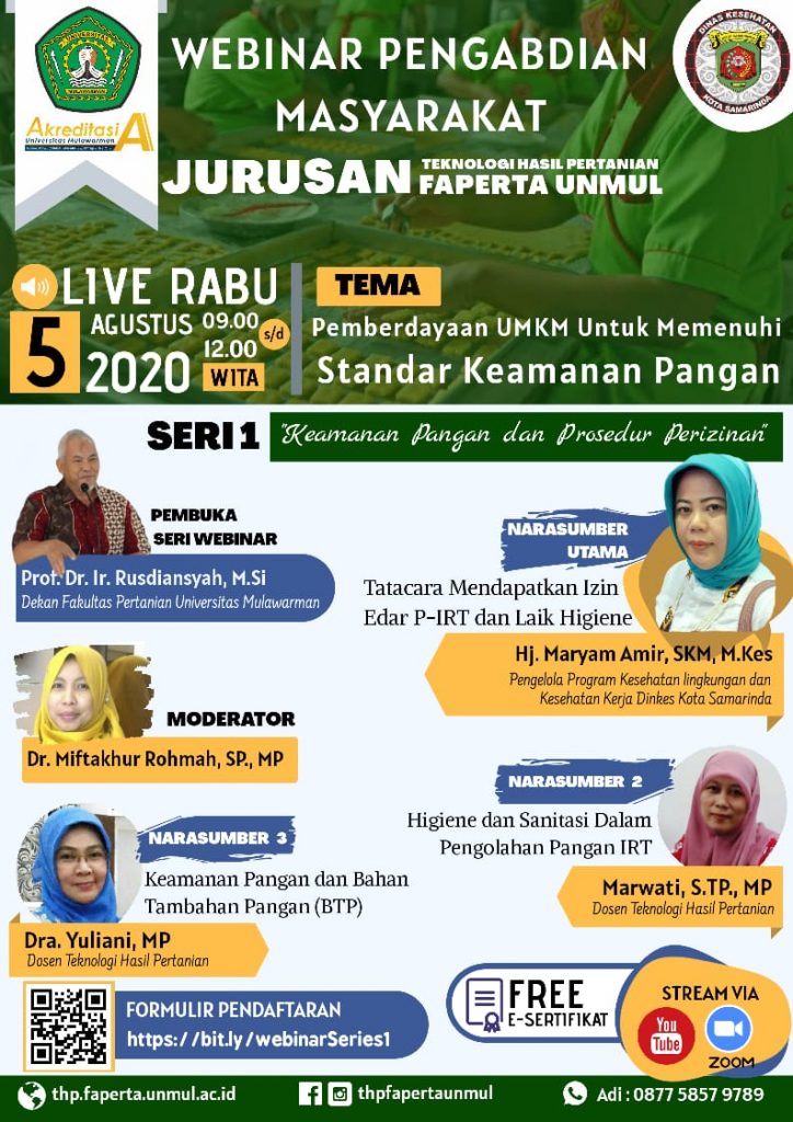 Bagian Seri 1 ini Jurusan Teknologi Hasil Pertanian mengambil tema “Keamanan Pangan dan Prosedur Perizinan” dengan menghadirkan narasumber dari berbagai bidang ahlinya. Sasaran yang dituju pada webinar kali ini yaitu kondisi UMKM yang banyak mengalami penurunan semenjak adanya covid-19 ini sehingga perlu adanya peningkatan kualitasnya dalam berbagai hal, disini lah Jurusan THP ingin membantu masyarakat umum dalam menjadi tempat untuk berbagi ilmu kepada masyarakat.