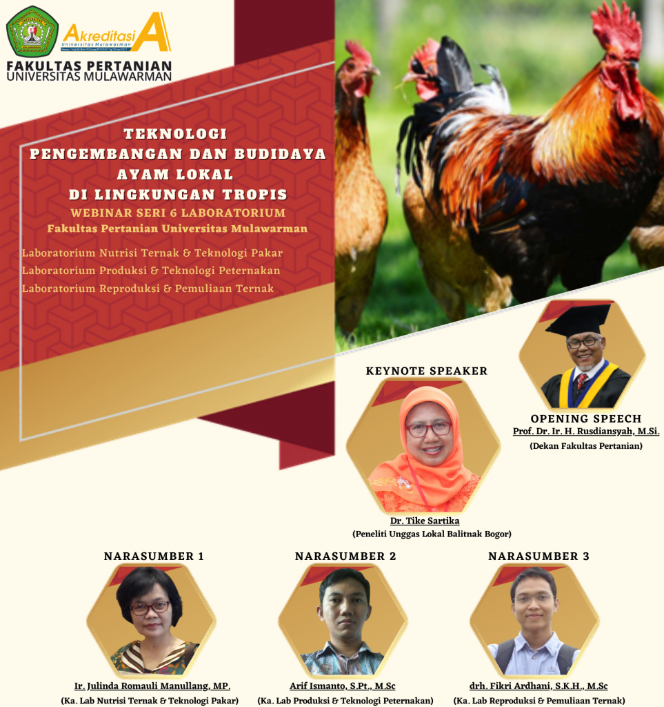 Tidak berselang lama jeda hari setelah webinar laboratorium seri 6, Fakultas Pertanian Universitas Mulawarman kembali melanjutkan Webinar Laboratorium Seri 6 di dekat penghujung akhir tahun 2020 ini, di momen kali ini Fakultas Pertanian mengangkat materi pembahasan yang berkaitan dengan ilmu yang dipelajari di laboratorium yang ada di Fakultas Pertanian yaitu Laboratorium Jurusan Peternakan. Pada hari Selasa (22/12/2020) pada pukul 09.00 WITA, Fakultas Pertanian mengadakan Webinar Seri 6 dengan tema “Teknologi Pengembangan dan Budidaya Ayam Lokal di Lingkungan Tropis” via Daring melalui Zoom Meeting. Kegiatan ini diawali oleh Ibu Sumiasih sebagai Pembawa Acara (MC) pada kegiatan pagi hari itu.